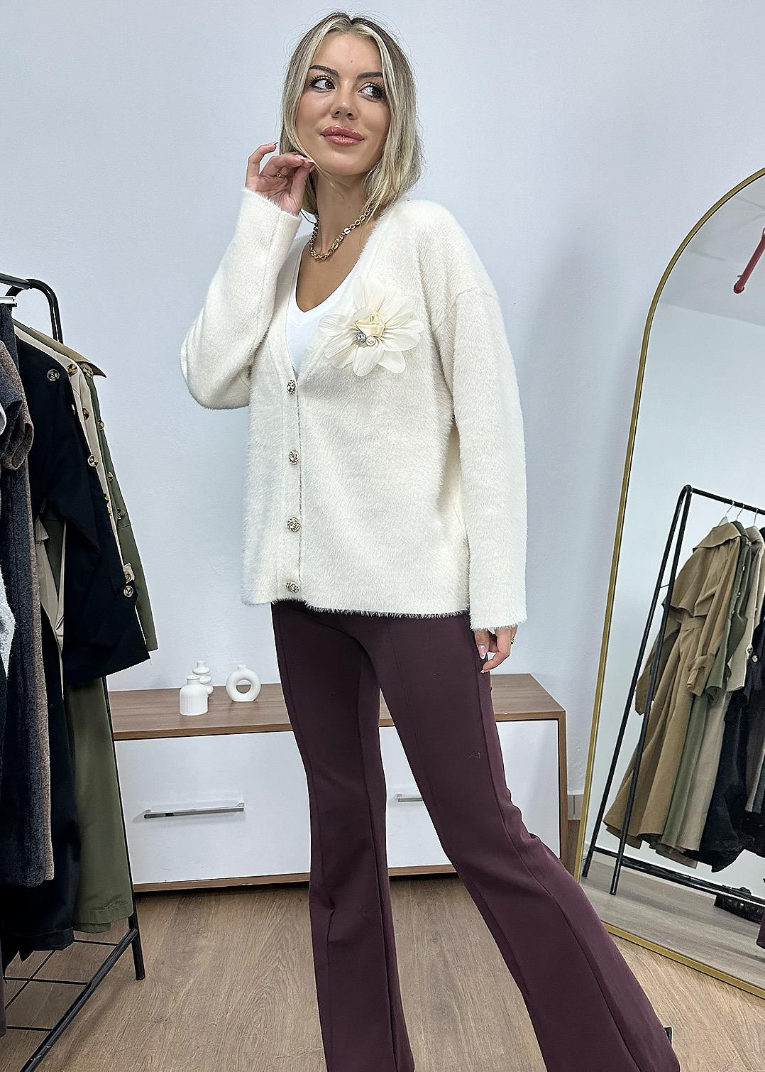 Gül Broşlu Taş Düğmeli Yumoş Hırka -Krem