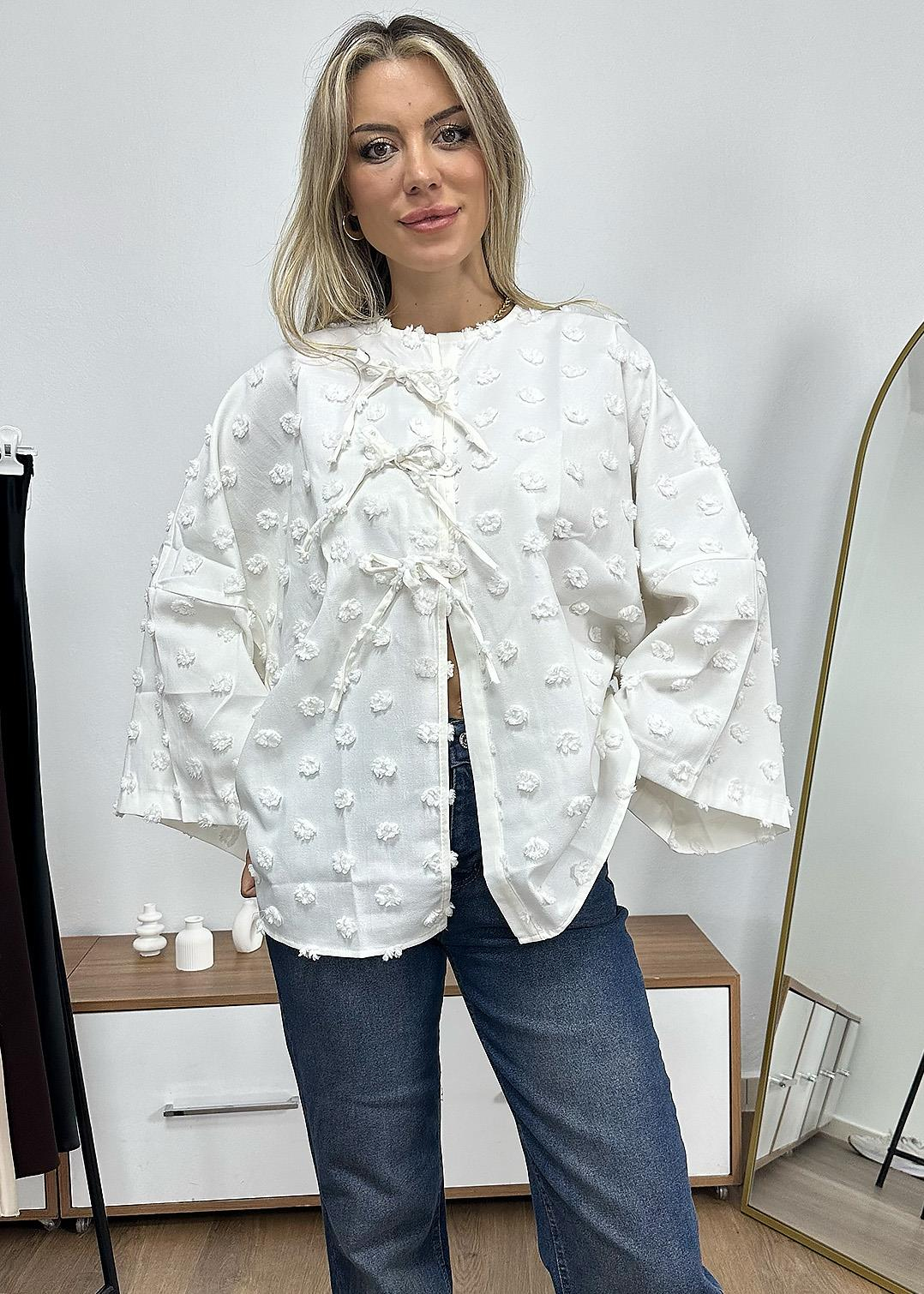 Önü Düğmeli İp Detaylı Püskül Puantiye Kimono - Beyaz