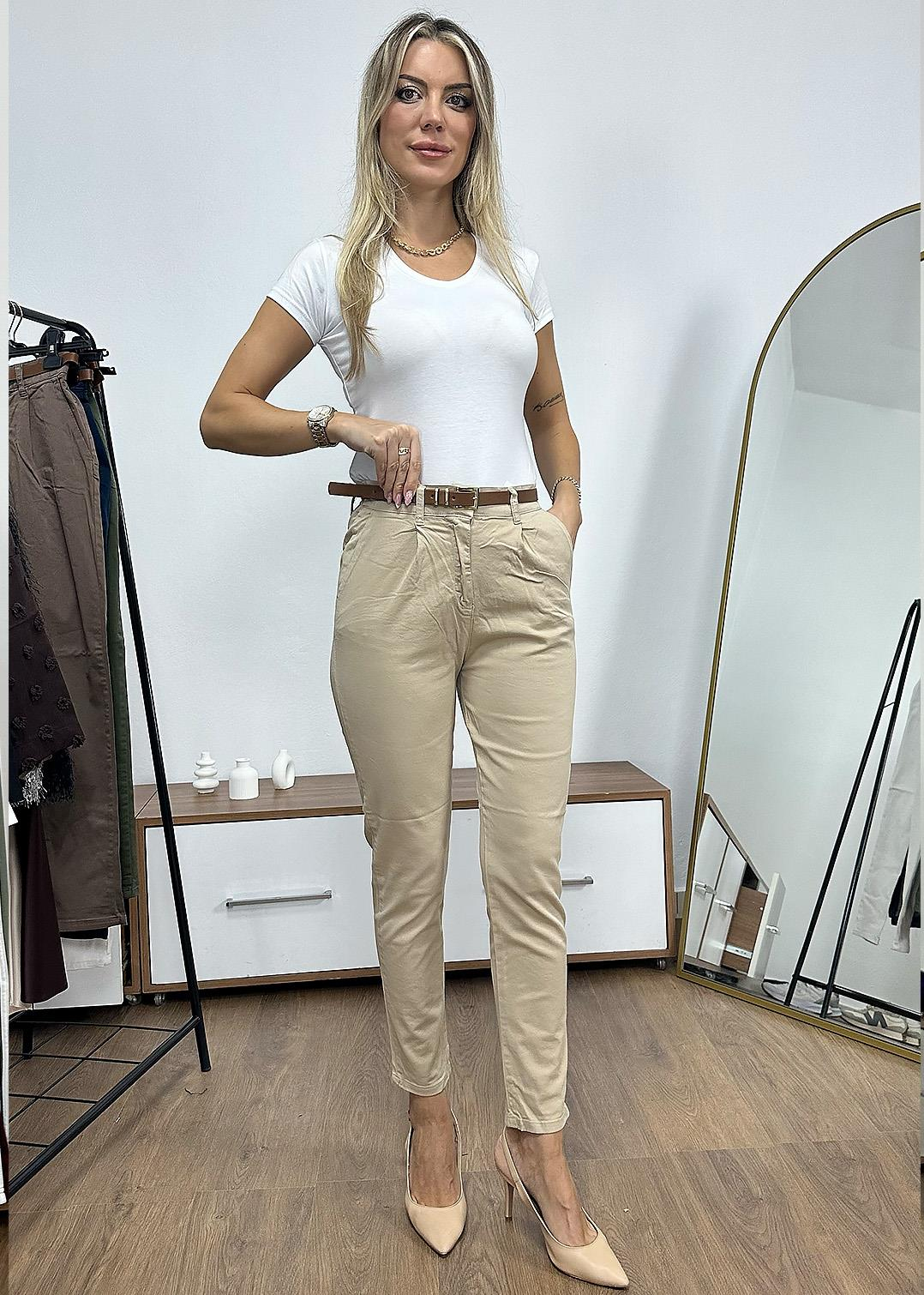 Önü Pileli Yüksel Bel Kemerli Dar Paça Pantolon - Taş