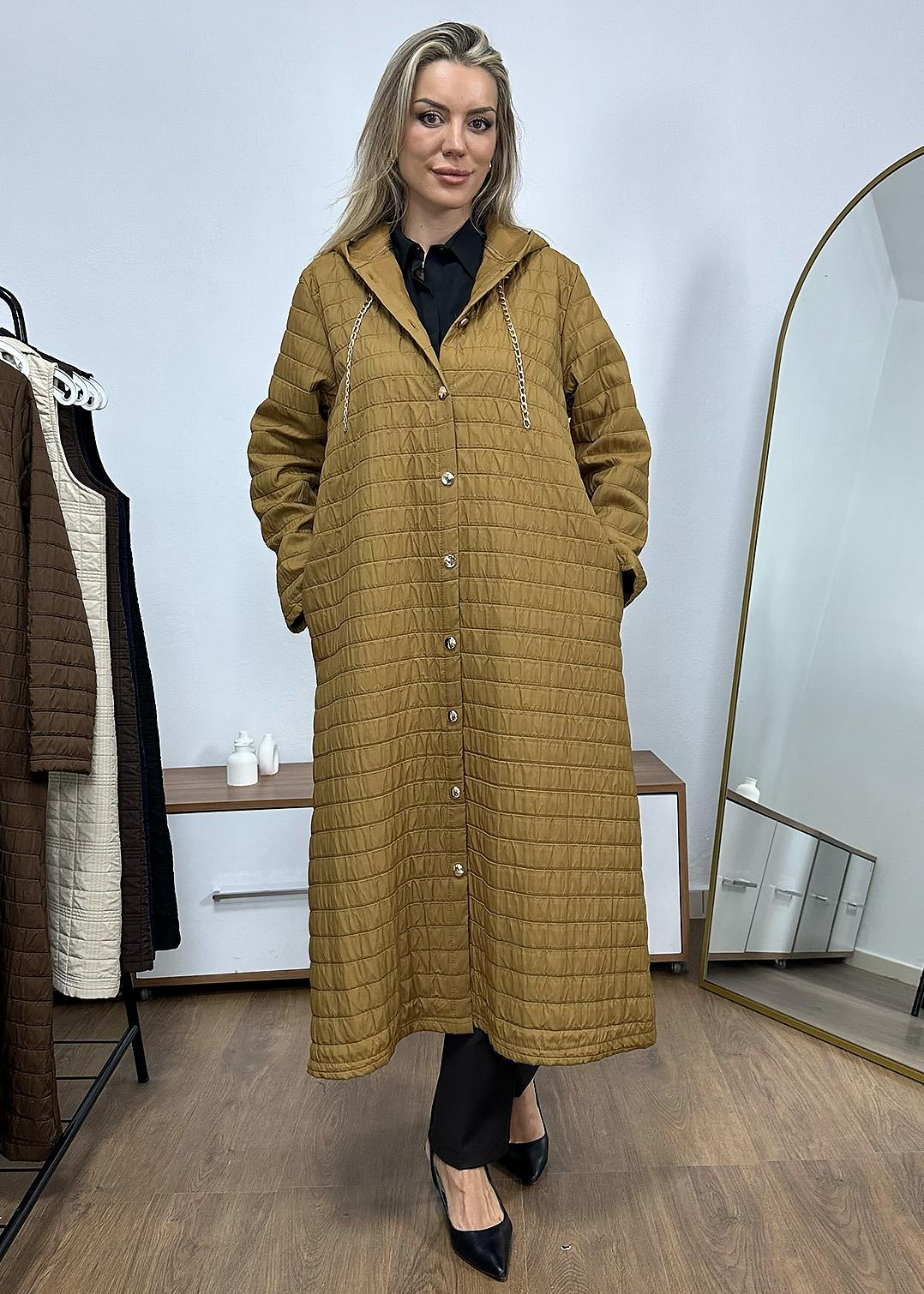 Yakası Zincir Detay Kapşonlu Kapitone Kap - Bej Yakası Zincir Detay Kapşonlu Kapitone Kap - Kahverengi Yakası Zincir Detay Kapşonlu Kapitone Kap - Hardal