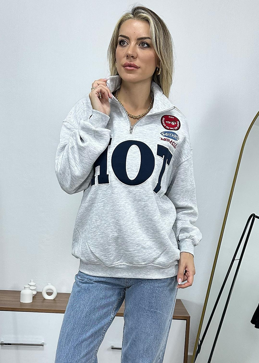 Yarı Fermuarlı  Nakışlı 3 İplik Sweat -Gri