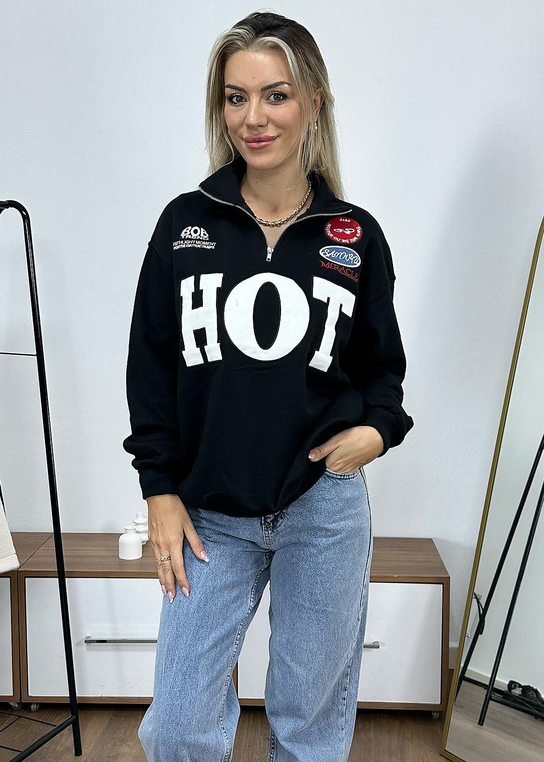 Yarı Fermuarlı  Nakışlı 3 İplik Sweat -Siyah